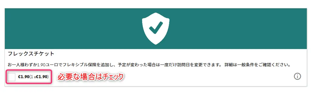 予約時にオプション追加でフレキシブル保険(1.9ユーロ)を追加できるようになり、未使用チケットは一度のみ日時変更ができます。