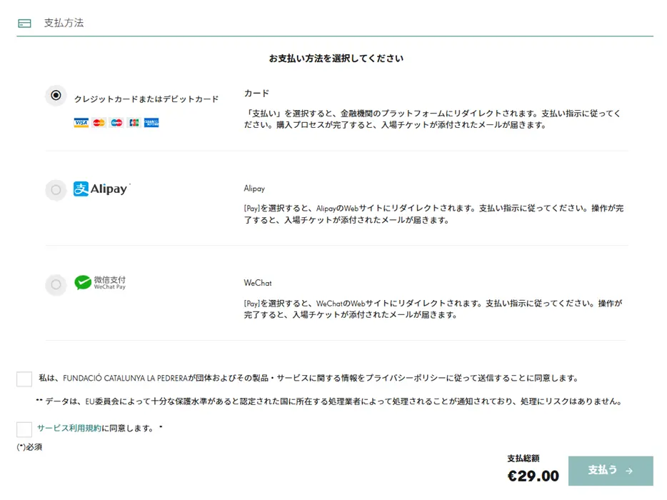 個人情報を入力・規約とプライバシーポリシーにチェック後、支払いへ進みます。