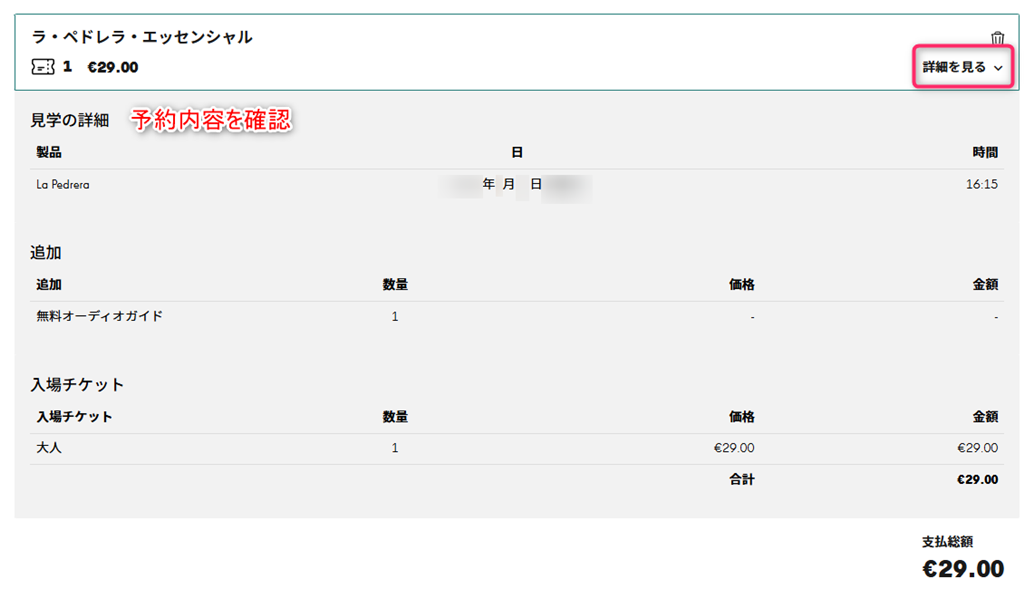 日本でも利用者が増えている人気の予約サイト「Get Your Guide」は、カサミラの入場チケット(日本語オーディオガイド付き)が予約でき、公式サイトと同額の29ユーロからです。(※2025年5月23日現在)